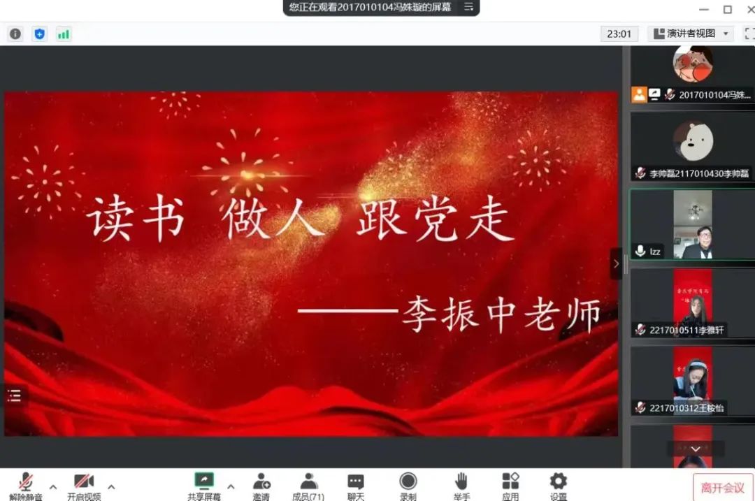 为进一步提升青马学员的思想政治觉悟,切实学习党的二十大精神,为同学们树立良好的人生观、价值观,必赢3003no1线路检测中心团委于11月17日组织青马学员开展线上青年马克思主义者培养活动。原副校长、现关工委副主任李振中老师以“读书 做人 跟党走”为主题向我院全体青马学员举办专题讲座。