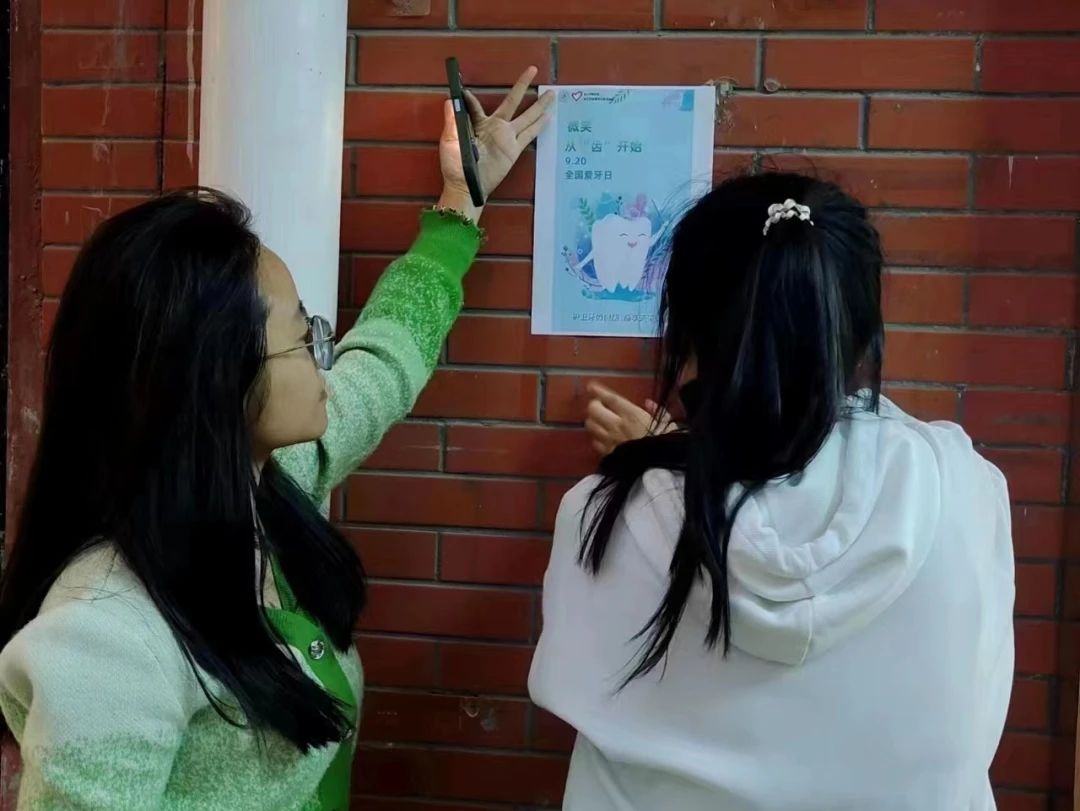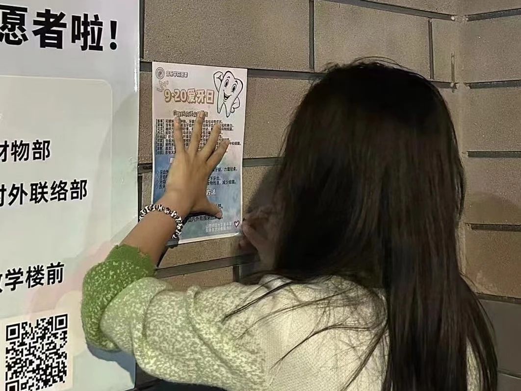 宣传日前一天,青协宣传组成员分工协作在校园里各处张贴提前打印好的宣传单和活动海报。在校园思政文化街、麦道餐厅附近、诚德购物中心门口、行健园一楼、南区操场附近、科学会堂门口等处都可以看到爱牙宣传知识海报。这些海报主要传达的内容是希望大家通过爱护牙齿健康,让我们心情更加愉悦,生活质量更有保障。