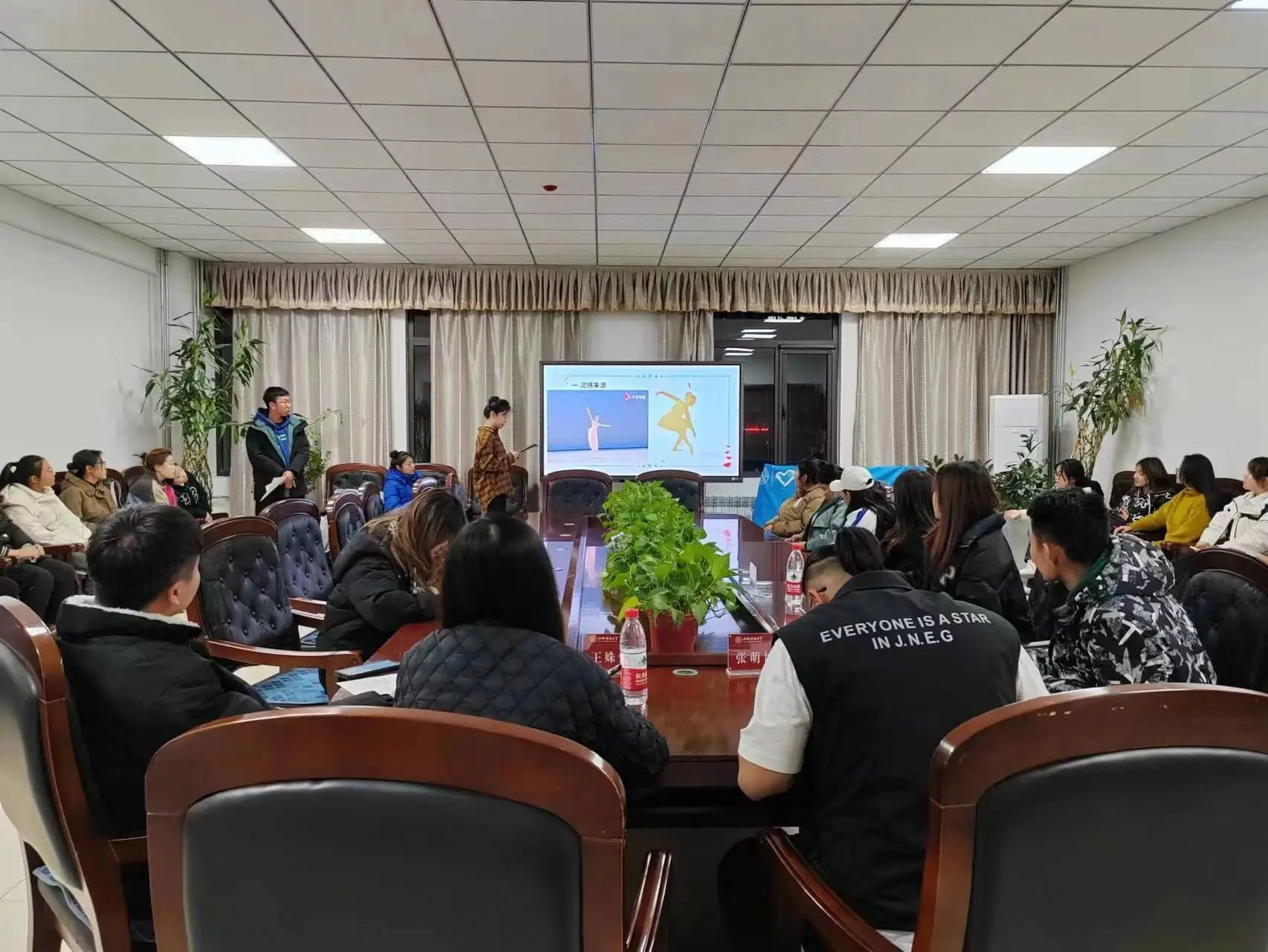 11月10日、11日晚八点,两场班赛在音乐舞蹈综合楼二楼会议室进行。比赛现场,各班参赛小组对各自设计的班徽作简短介绍,他们充分发挥自己的创意和想象力,用鲜艳的色彩、独特的图案和简洁的文字,将班徽设计的既有视觉冲击力,又富有深刻内涵。
