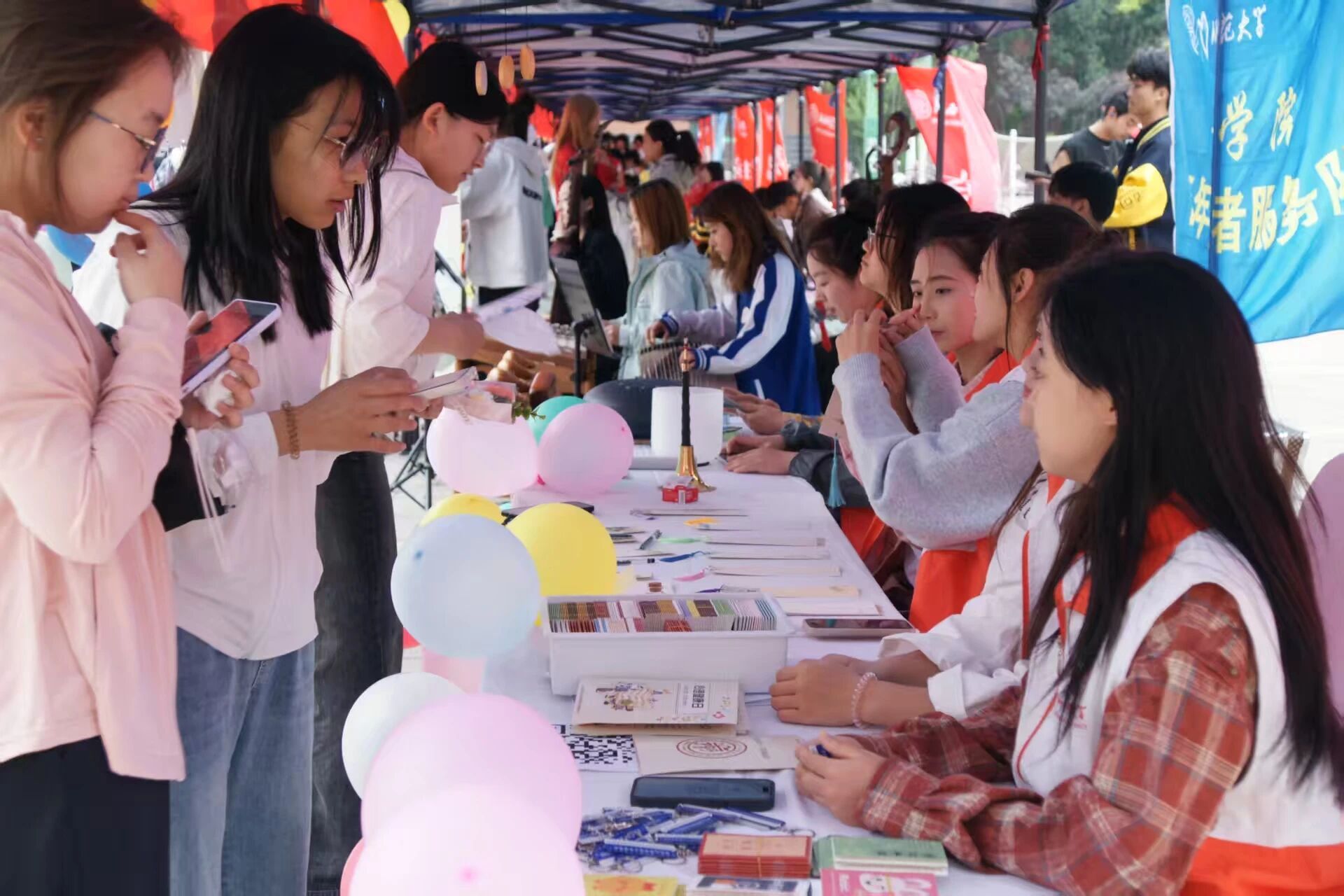 “自然声景·森林音境角”同样人气爆棚。在这里,同学们依次体验空灵鼓、钵、木鱼、风铃等模拟自然声的乐器。在风铃环节,志愿者引导同学们深呼吸,轻轻向风铃呼气,清脆悦耳的铃声缓缓响起,仿佛置身于静谧的森林之中,帮助同学们舒缓压力,放松身心。而手鼓、打击乐模拟的心跳节奏,引导者通过节奏变化隐喻情绪管理,让同学们在节奏的律动中感悟情绪的起伏与调节方法。
