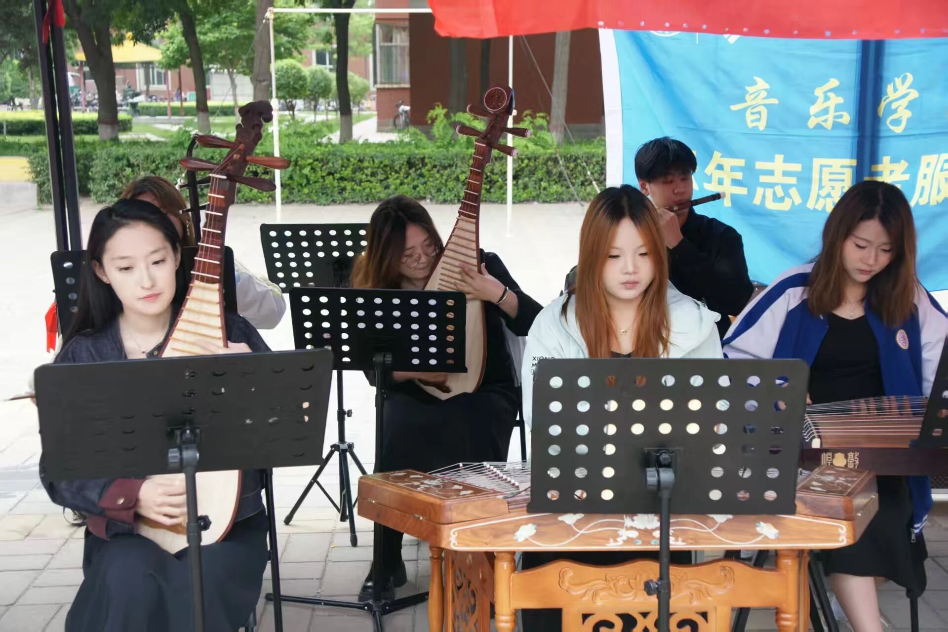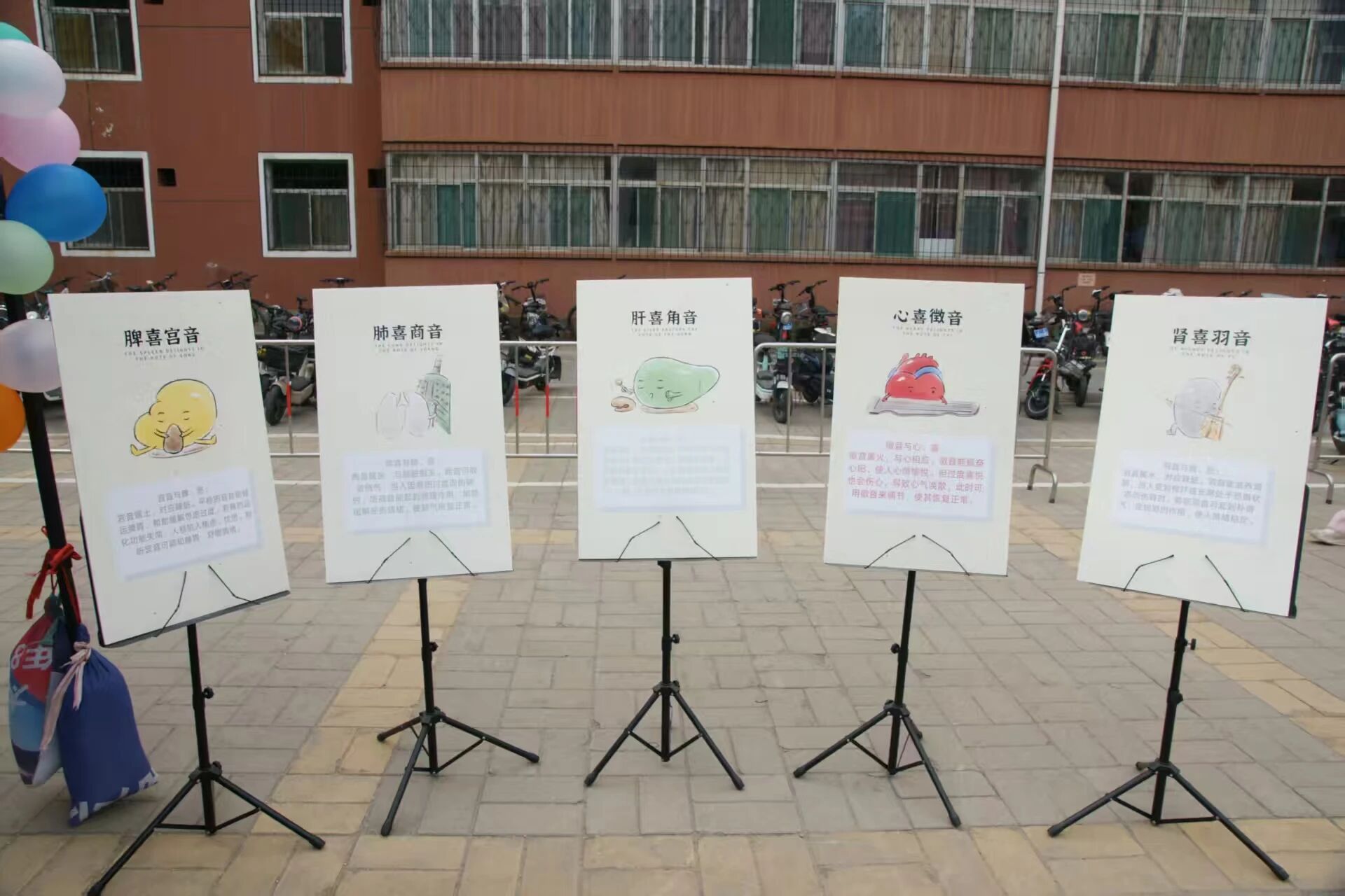 活动现场,“丝竹雅韵·乐润心田”器乐展示区首先映入眼帘。琵琶、扬琴、古筝、二胡、竹笛的同学们带来精彩绝伦的表演。合奏曲目《彩云追月》旋律轻盈流畅,乐器配合默契,宛如夜幕中彩云追逐明月,营造出静谧而美妙的意境;《金蛇狂舞》节奏激昂欢快,将现场气氛推向高潮,让同学们感受到传统民乐的独特魅力。此外,唢呐独奏《黑土地》以其高亢嘹亮的音色,生动展现出广袤黑土地的雄浑与热情。在器乐展示区域旁,五行五音五脏的展板格外引人注目,展板详细说明了五音与五脏的情绪关系,吸引同学们驻足阅读,在欣赏音乐的同时,深入了解传统音乐文化中蕴含的身心调节智慧。