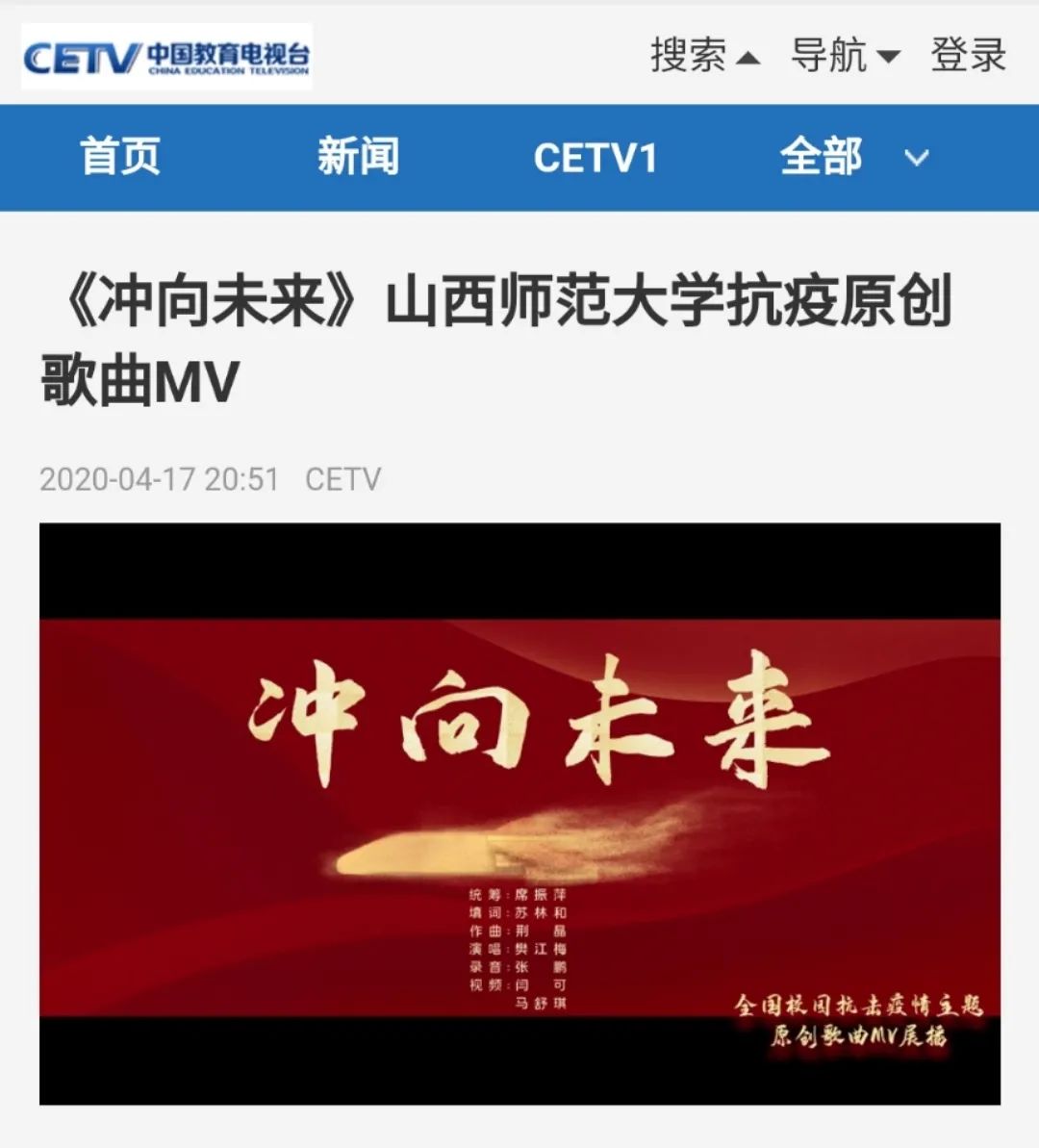近日,必赢3003no1线路检测中心必赢3003no1线路检测中心原创MV《冲向未来》被中国教育电视台在全国校园抗击疫情主题原创歌曲MV中展播。