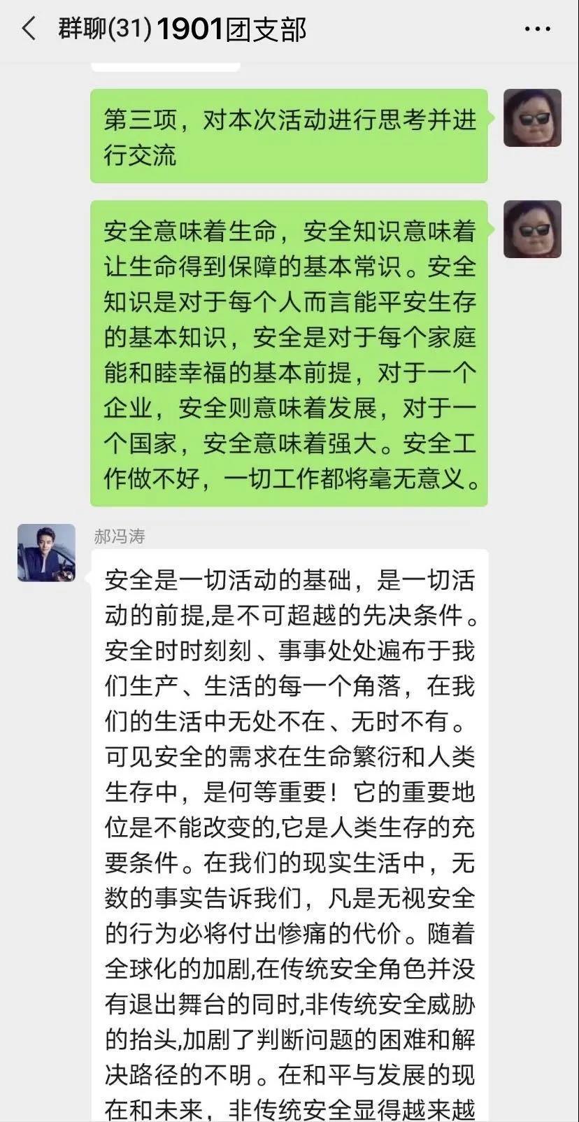 本次活动以各班团支部为单位,采取线上会议形式。首先各团支书向同学们介绍了此次团课活动的背景以及开展活动的目的和意义,并分享了视频链接及相关文章。在活动中,同学们认真学习网络安全、交通安全、出行安全、人身安全等内容,并通过视频会议的方式进行讨论,在班级群内积极分享自己学到的知识和感悟。
