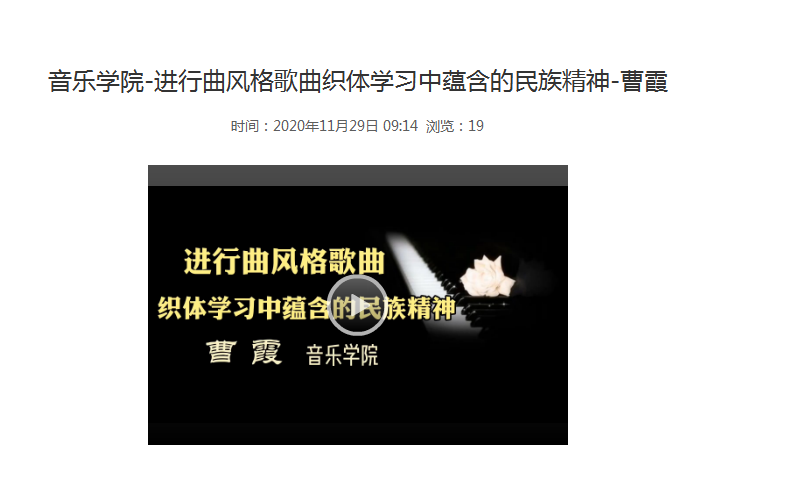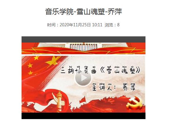 为落实《高等学校课程思政建设指导纲要》(教高〔2020〕3 号)文件精神,推进我校课程思政建设工作取得阶段性成果,学校于11 月中旬举办了“首届课程思政微课比赛”,我院青年教师积极参加,经院内评比-推荐作品提交-送审,音乐学专业教师曹霞获得二等奖、乔萍获得三等奖。