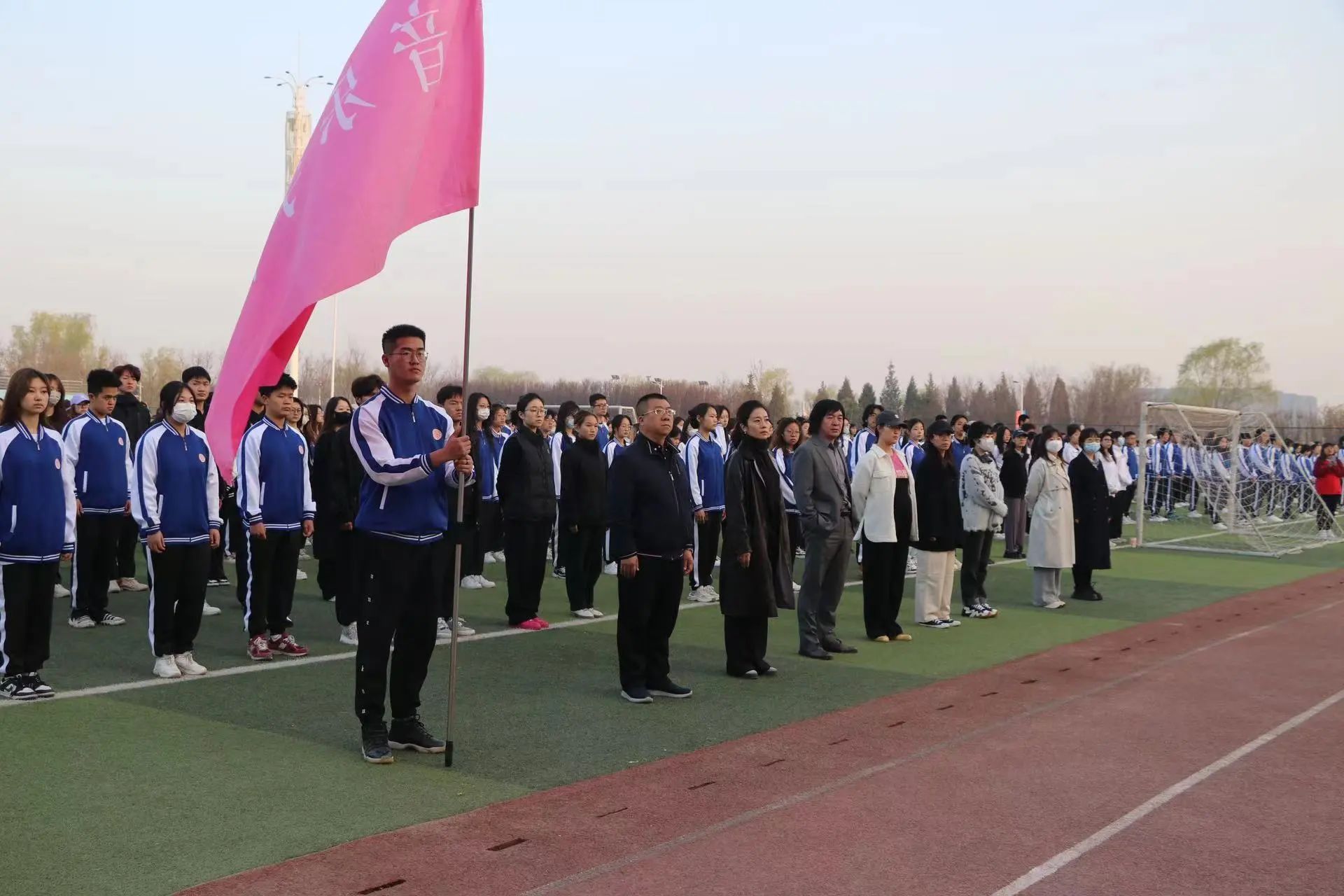 同学们穿着校服有序地列队在操场上,随着主持人宣布升旗仪式开始,全场师生面向国旗,在雄壮的国歌声中,五星红旗缓缓升起,迎风飘扬。