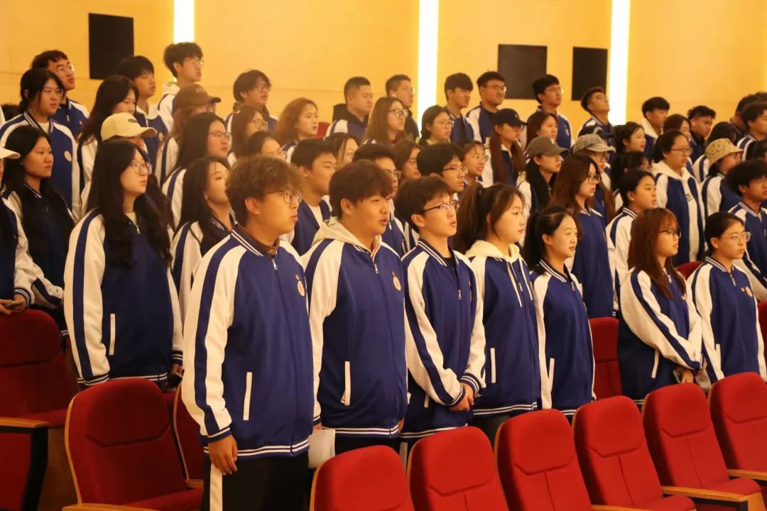 全体起立齐唱共青团团歌《光荣啊,中国共青团》,团歌是共青团的象征,它凝聚了团员的青春和力量,激励了同学们对共青团的热爱与向往。