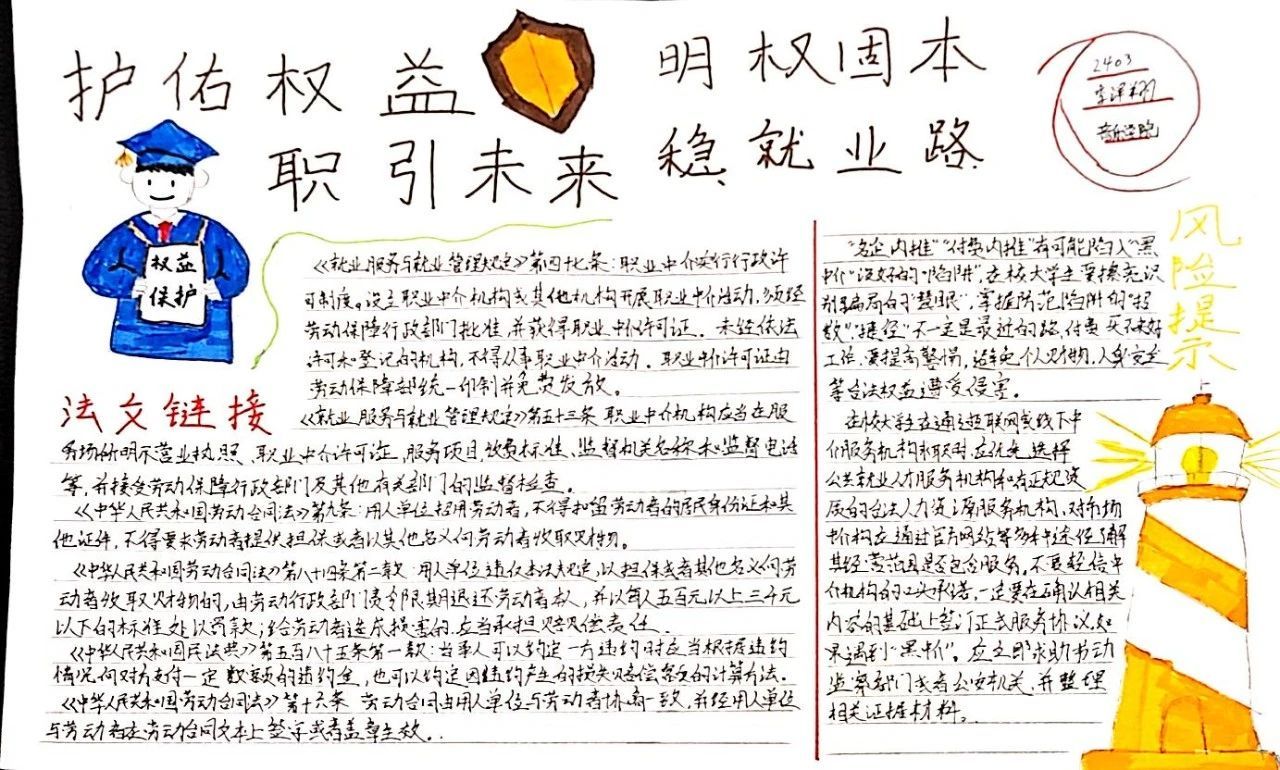 4月15日,必赢3003no1线路检测中心学生会权益部面向非毕业生举办了“权益护航·法治同行”主题活动,以征集“就业权益保护”主题手抄报的形式,吸引了众多同学参与。同学们充分发挥自身创意与艺术特长,在手抄报上用鲜艳色彩、精美插画和清晰文字,生动呈现就业权益保护要点,内容涵盖劳动合同签订注意事项、职场侵权应对方法、劳动法律法规知识等,同学们在手抄报创作过程中,也对就业权益保护知识有了更深入的了解。