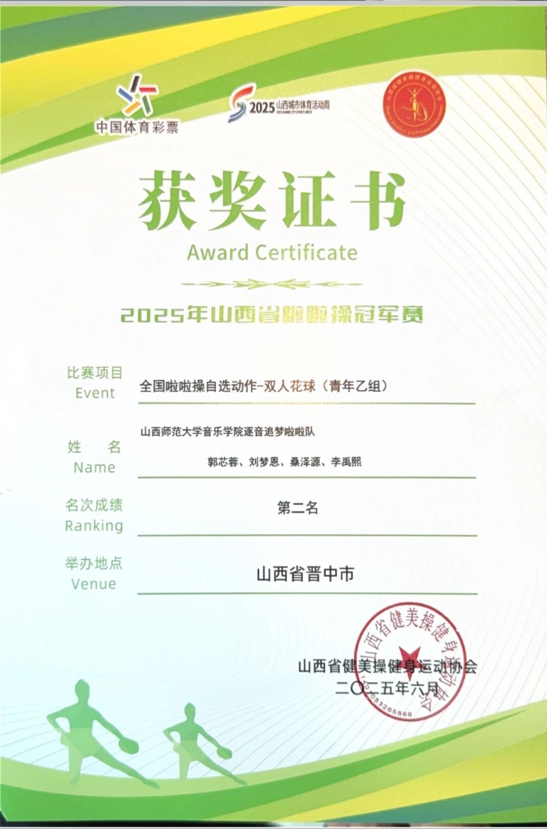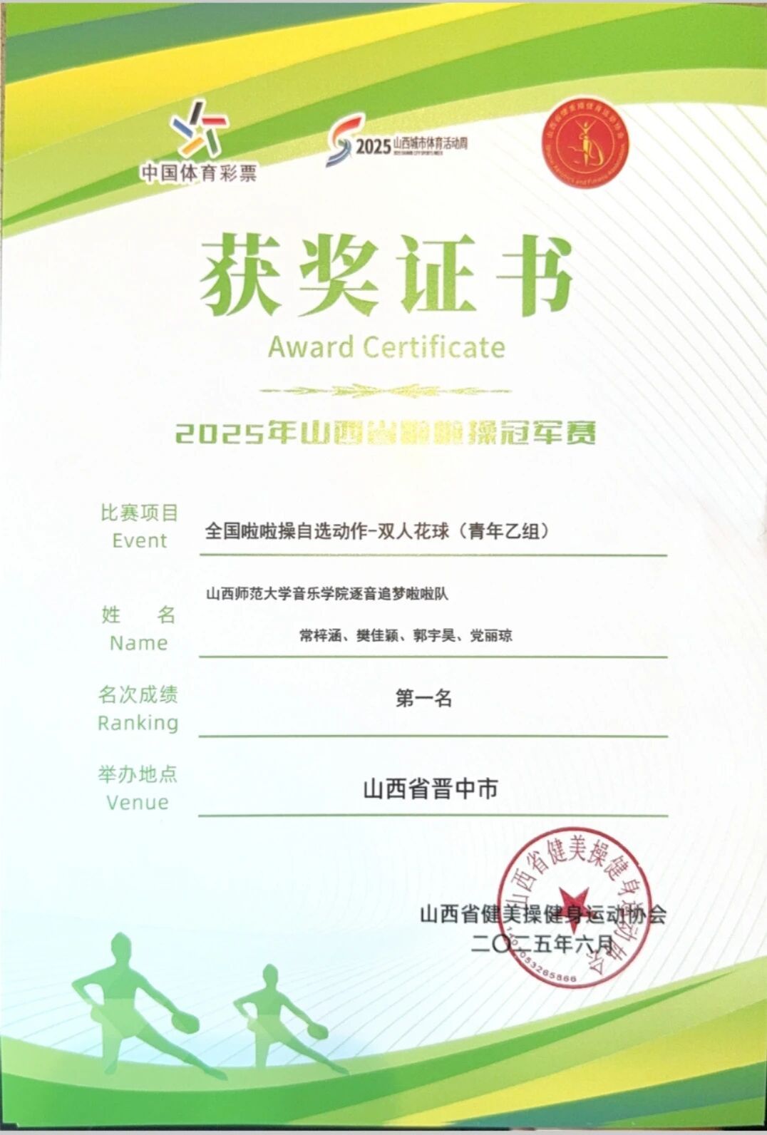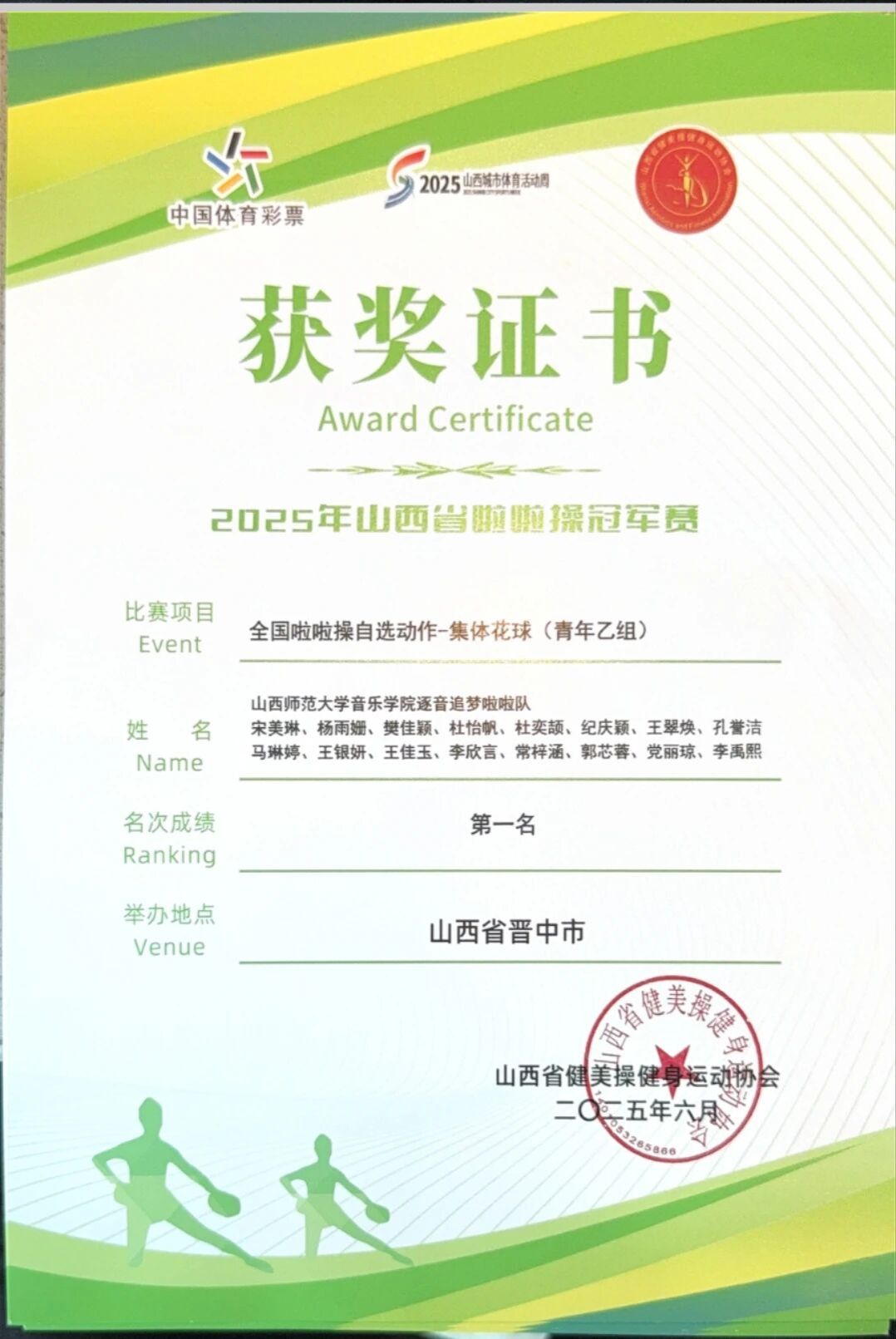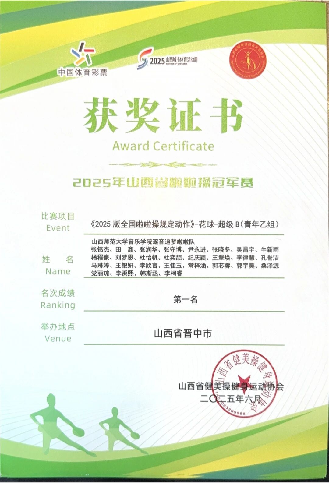 5月31日,2025年山西省啦啦操冠军赛在晋中市圆满落幕。本次赛事由山西省体操武术运动中心、山西省健美操健身运动协会联合主办,晋中市体育局倾力承办,吸引了山西省各地区、各学校的 84 支精英队伍、1600 余名怀揣梦想的运动员齐聚一堂,共同角逐啦啦操领域的至高荣誉。在这场高手如云的激烈比拼中,必赢3003no1线路检测中心必赢3003no1线路检测中心“逐音追梦”啦啦操队凭借默契无间的配合、惊艳全场的出色表现,一举斩获“全国啦啦操自选动作 - 集体花球(青年乙组)”冠军、“全国啦啦操规定动作 - 花球 - 超级 - B(青年乙组)”冠军、以及“全国啦啦操自选动作 - 双人花球(青年乙组)”冠军与亚军殊荣,以卓越实力彰显了音院学子青春飞扬、激情澎湃的风采。