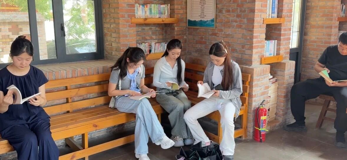 除了文艺演出,实践队队员们还在夜校读书角阅读书籍,书籍涵盖文学、历史、科普等多个领域,与村民们一起分享读书心得。在分享会上,大家畅所欲言,交流思想,营造了浓厚的学习氛围。一位村民表示:“平时忙农活,很少有时间读书,通过这次读书分享会,我不仅读到了好书,还学到了很多知识,希望以后能多举办这样的活动。”