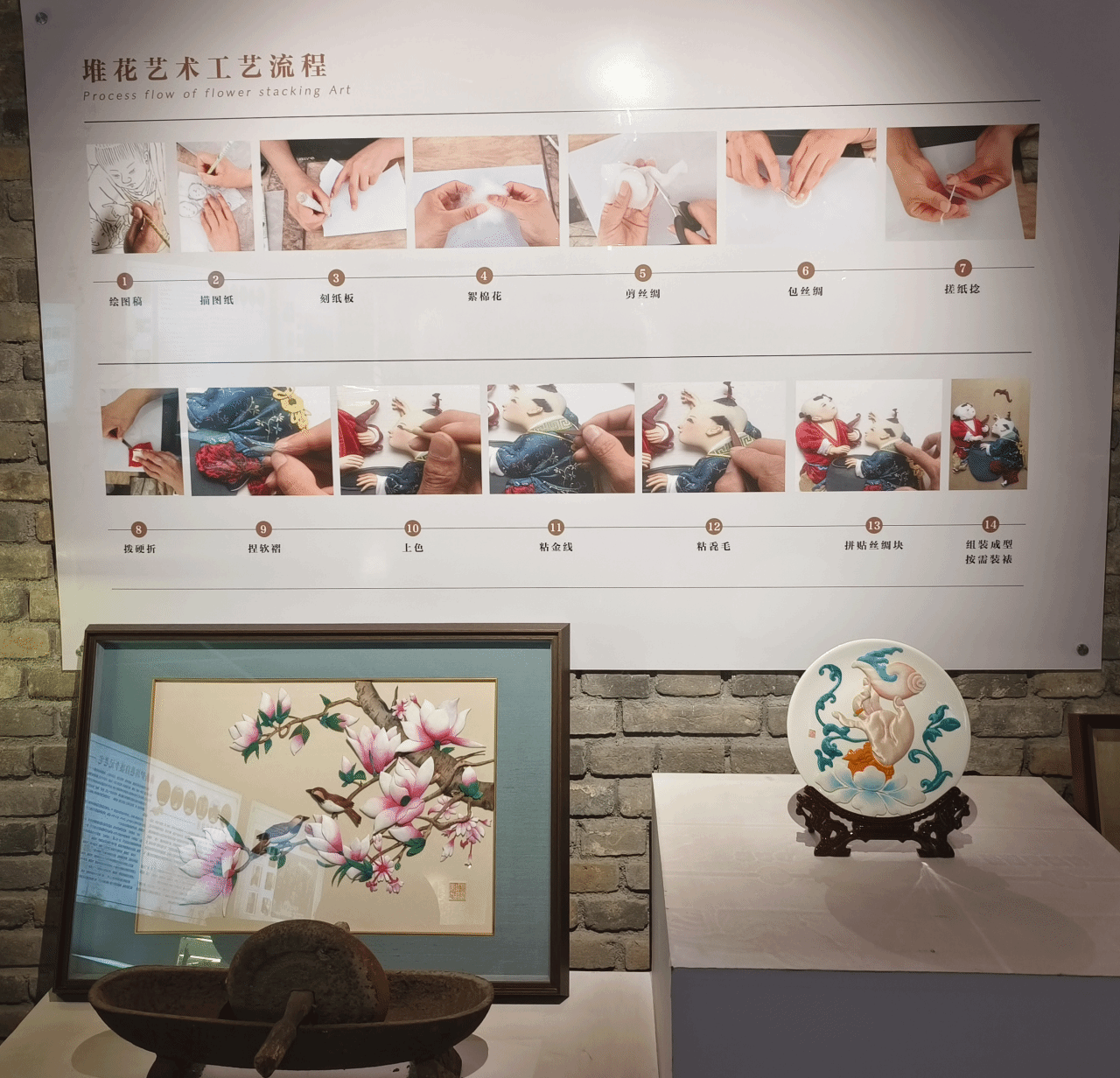 在手工艺人的讲述下,我们了解到堆花艺术工艺流程分为:绘图稿、描图纸、刻纸板、絮棉花、剪丝绸、包丝绸、搓纸捻、拨硬折、捏软褶、上色、粘金线、粘毳毛、拼贴丝绸块、组装成型按需装裱。流程多且复杂。