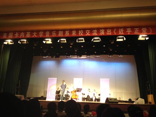 6月2日晚7:00,美国卡内基大学音乐剧主席和系主任科琳·奈斯博士等6名教师,13名学生在文化艺术活动中心为我校师生上演了音乐剧《近乎正常》。该剧是一部在全世界范围内广受欢迎的摇滚音乐剧,2010年该剧获得了普利策戏剧奖,是历史上第八个赢得该奖项的音乐剧。剧中描述了一位患有躁郁症的母亲与疾病挣扎的过程,以及她的症状给她的家庭关系带来的影响。这部音乐剧也谈到了失去亲人的哀痛、自杀、药物滥用、现代精神病医学中的争议等话题。该剧的演出开阔了师生眼界,促进了中西音乐表演文化交流,对我院今后的音乐与舞台实践教学提供了宝贵经验。