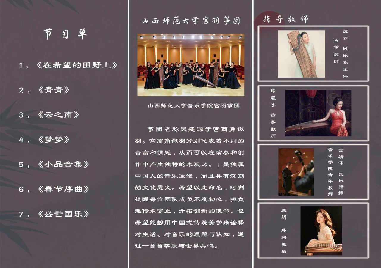 宫羽乐团的师生们,在岁月的磨砺与艺术的雕琢下,技艺精湛,情感充沛。她们以古筝为媒介,将山西的壮丽山河、民俗风情与千年文化底蕴融入弦音之中。从冉冉希望到滔滔汾水,从腾云驾雾到大堂盛世,音乐会曲目编排独具匠心,传统曲目经重新演绎,焕发出崭新活力;原创佳作汲取本土养分,别具一格。您将在音符的交织中,领略山西的壮美与柔情,感受传统与现代的激情碰撞,体会古筝艺术的博大精深。