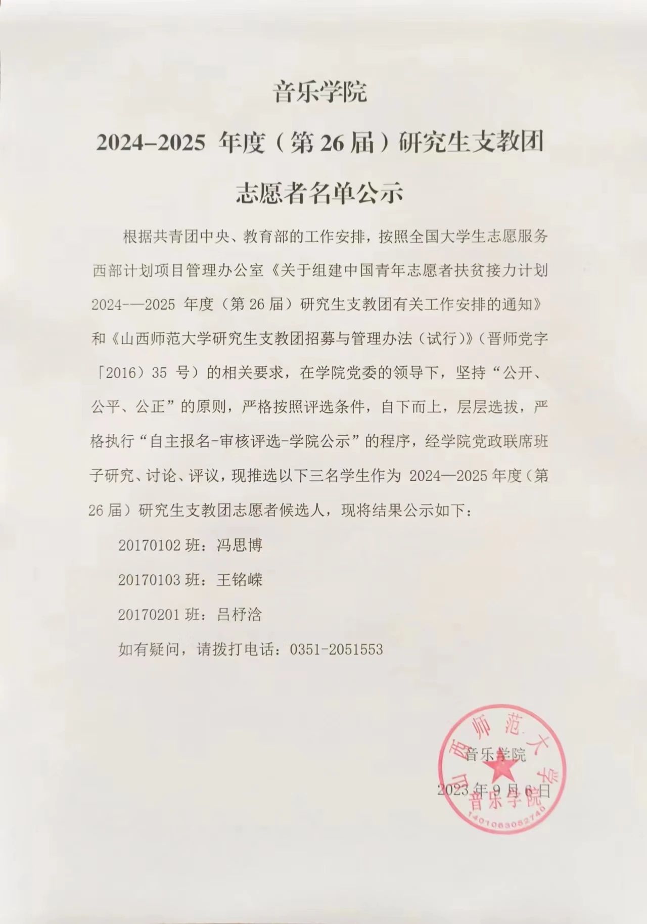 必赢3003no1线路检测中心2024-2025 年度(第26届)研究生支教团志愿者名单公示