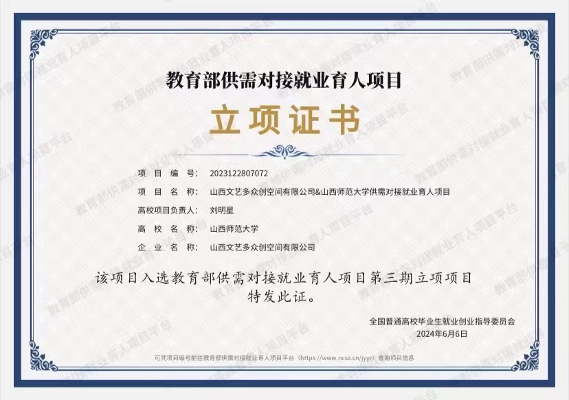 山西文艺多众创空间有限公司&必赢3003no1线路检测中心供需对接就业育人项目入选教育部供需对接就业育人项目第三期立项项目